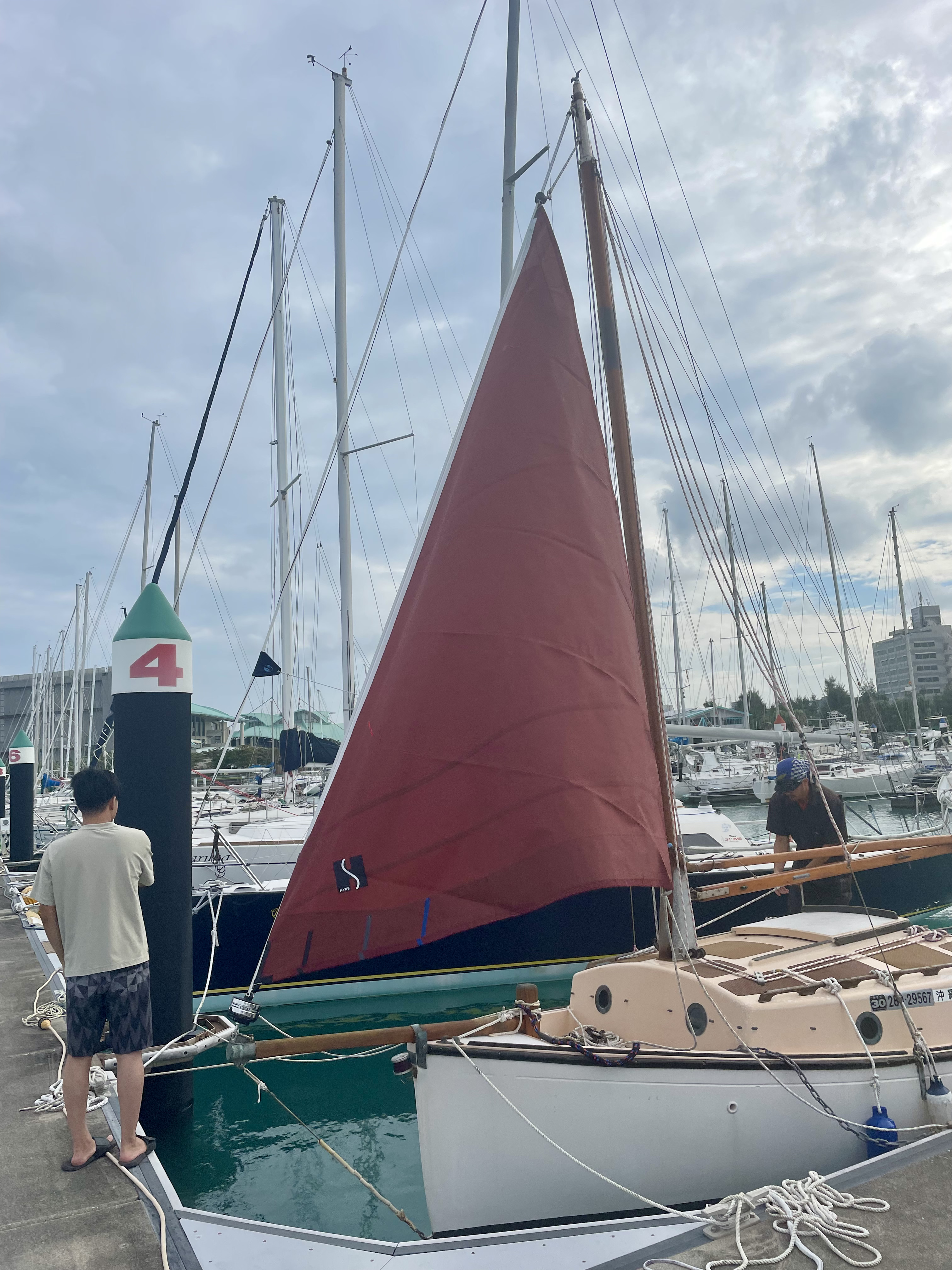 You will remember that I have been waiting for months for the Japanese sailmaker to finish cutting the sail. They plead the difficulty in getting tan colored sail cloth. I do not really mind as I have a vision of ancient Japanese sailmaker cutting my new sail with exquisite care in softly lit ancient sail loft. He then hand sews the luff bead with tiny stitches. It is worth the wait.