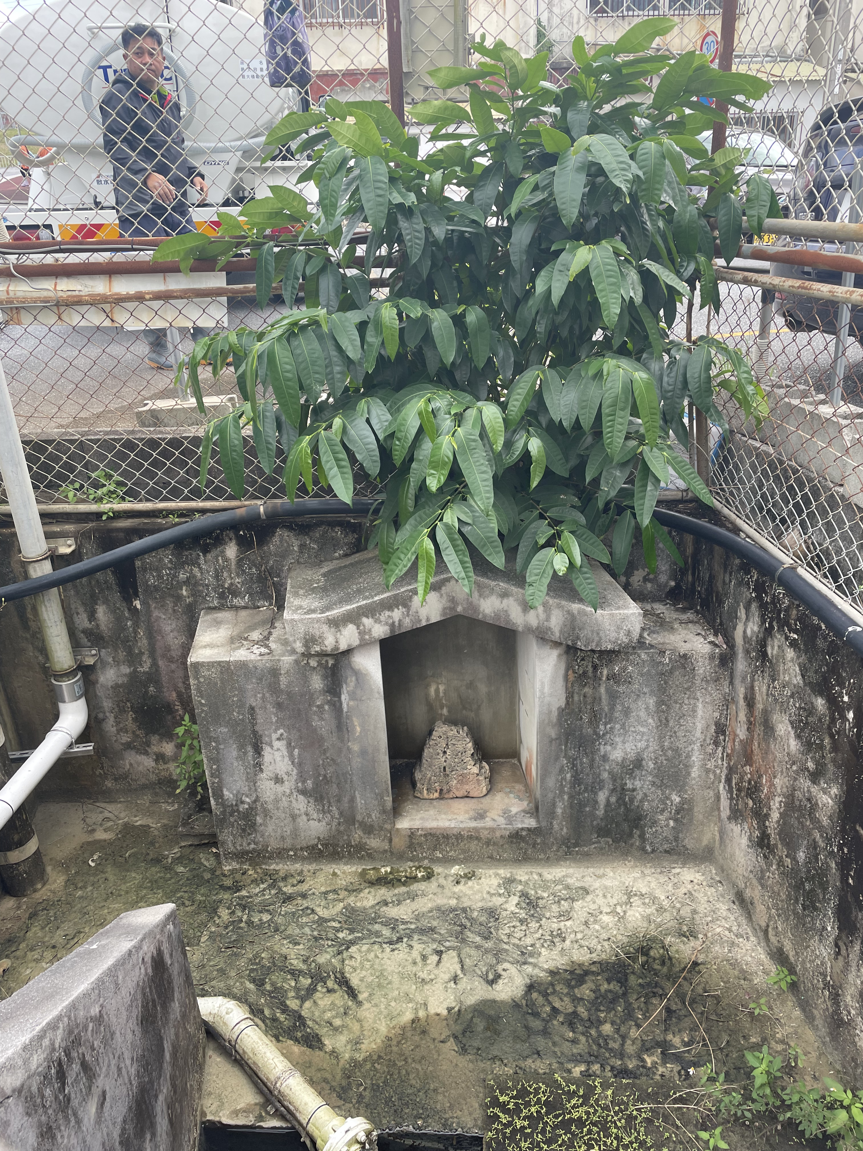 I had noticed for some time that water bowsers stopped there to fill up with water. I finally go to have a look. The shrine is very well hidden behind a scruffy wire fence. Inside there is a clear spring pool and an ancient piece of stone. I assume that this is a holy pool where people have worshipped for hundreds of years but has been reduced to providing water for bowsers.