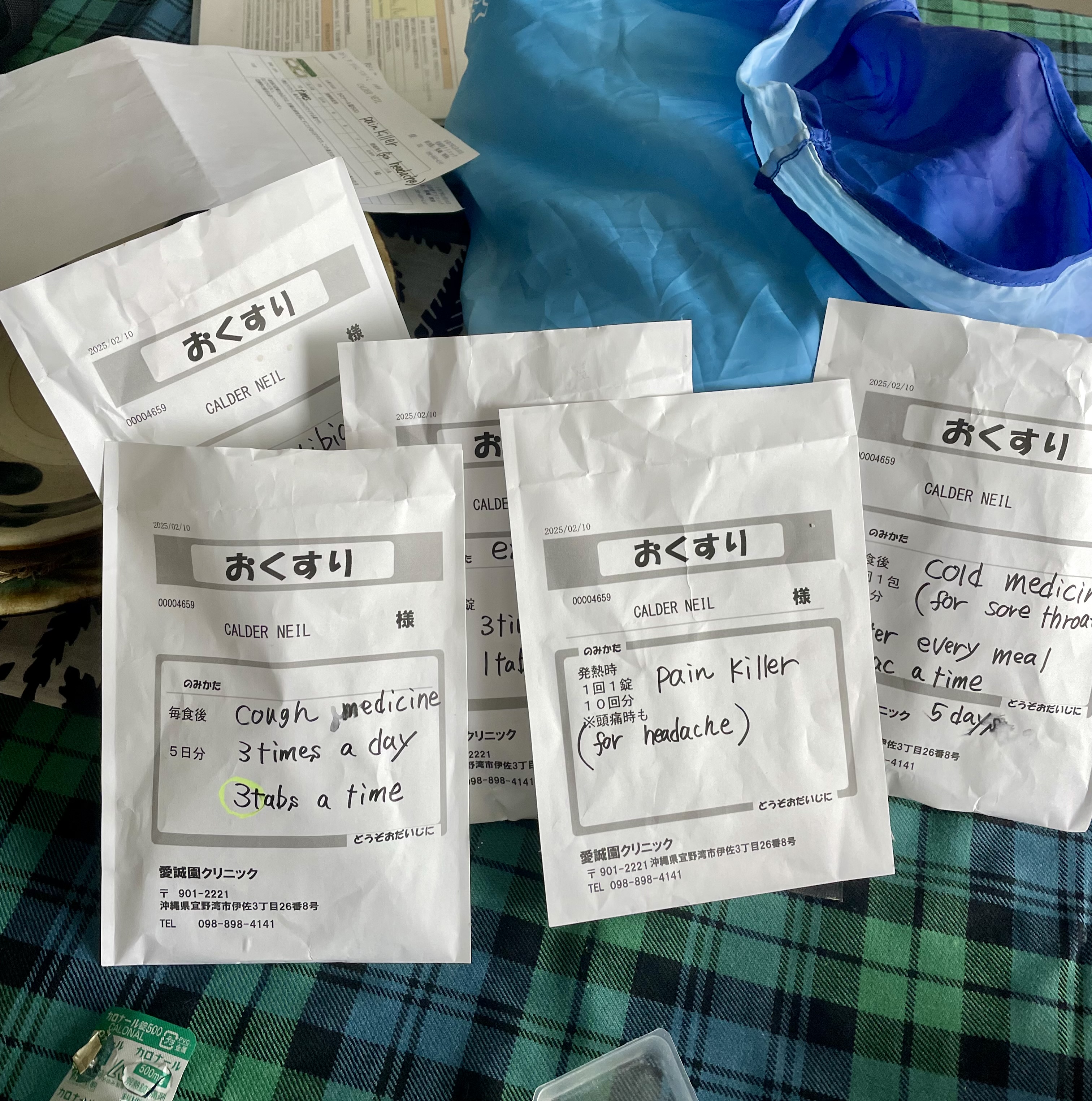 Nagasaki sensei examines me in the car and tells me I have Covid or Corona virus in Japanese. I get lots of medication.