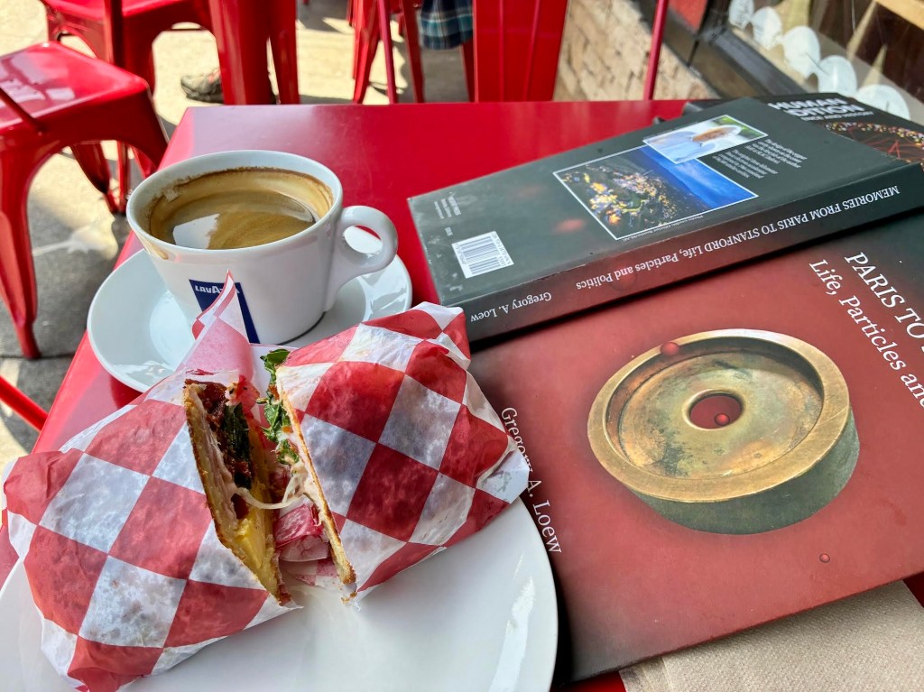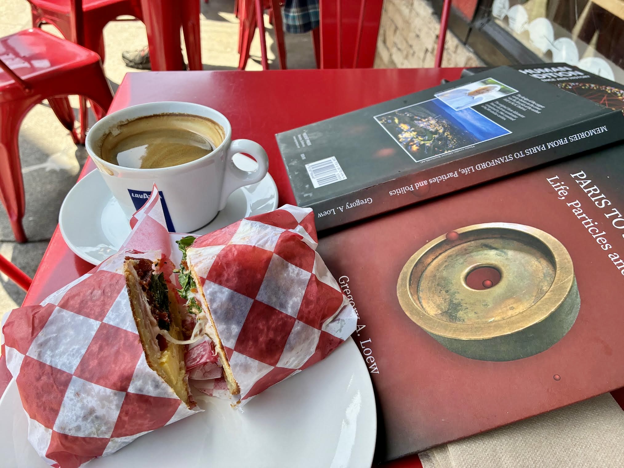 I read the first pages of Greg’s book drinking excellent coffee with a hot; egg bacon, ham, cheese, salad croissant.