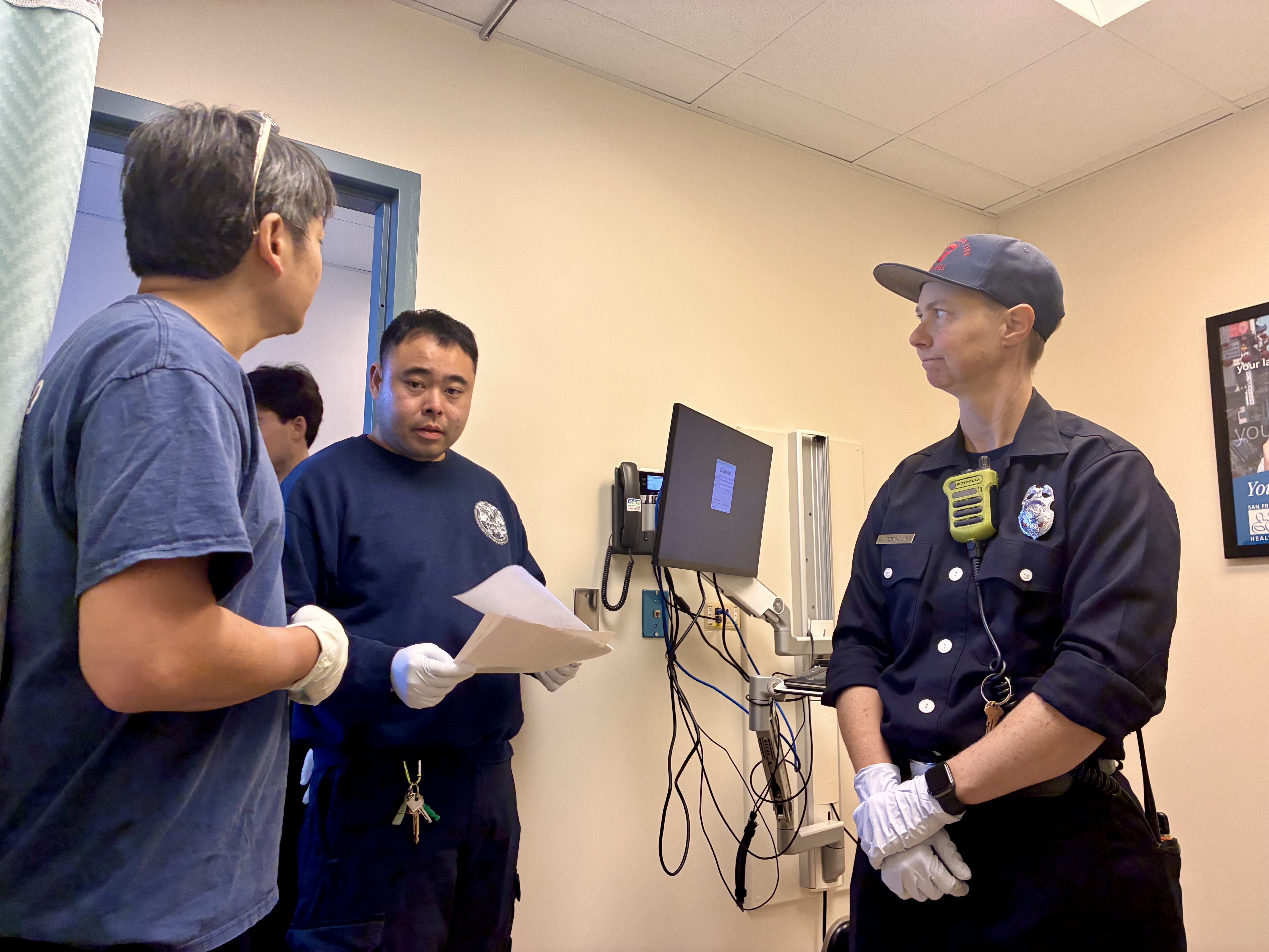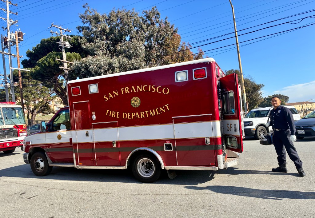 A huge San Francisco Fire Department (SFFD) truck and beautiful ambulance are disgorging paramedics into the parking lot.