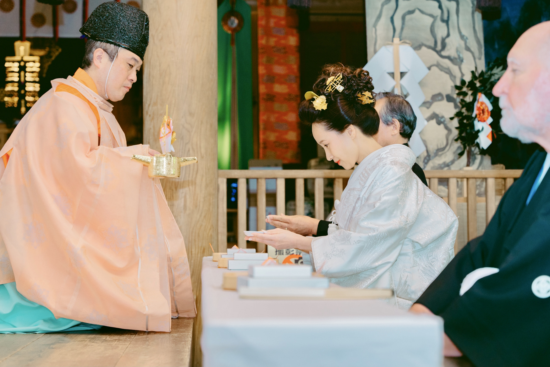 I have two roles, first in front of the altar, I receive a decorated branch. This I manipulate in a prescribed fashion and make a wish. I then re- manipulate the branch and lay it on a table in front of the altar. I bow twice, clap twice, bow again and return to my stool. Towards the end, I have to make the congratulatory toast to the bride and groom – in Japanese! Amazingly I don’t blow it.