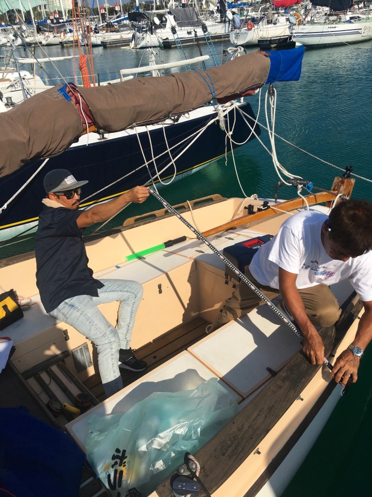 Here is a sub plot. Mitsuba san is a sailmaker and boat cover maker and he is going to make me a tailor-made cover for the boat. He comes by on Monday and starts measuring up the boat for its new set of clothes. There will be several fittings before the bespoke cover is finished.