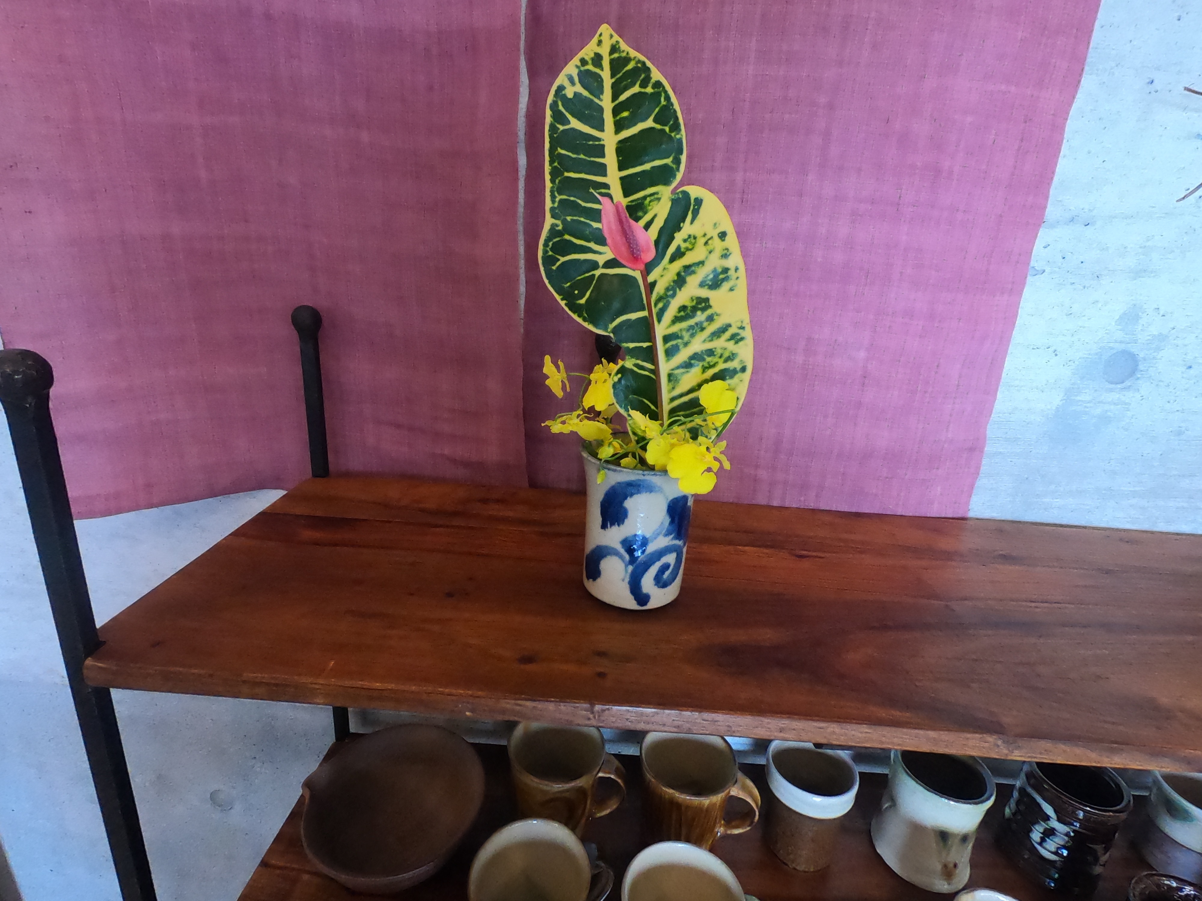 We then all get the same selection of flowers and leaves and are told we can select any of the wonderful Yachimun, Okinawan pottery, bowls or vases on display in the restaurant.