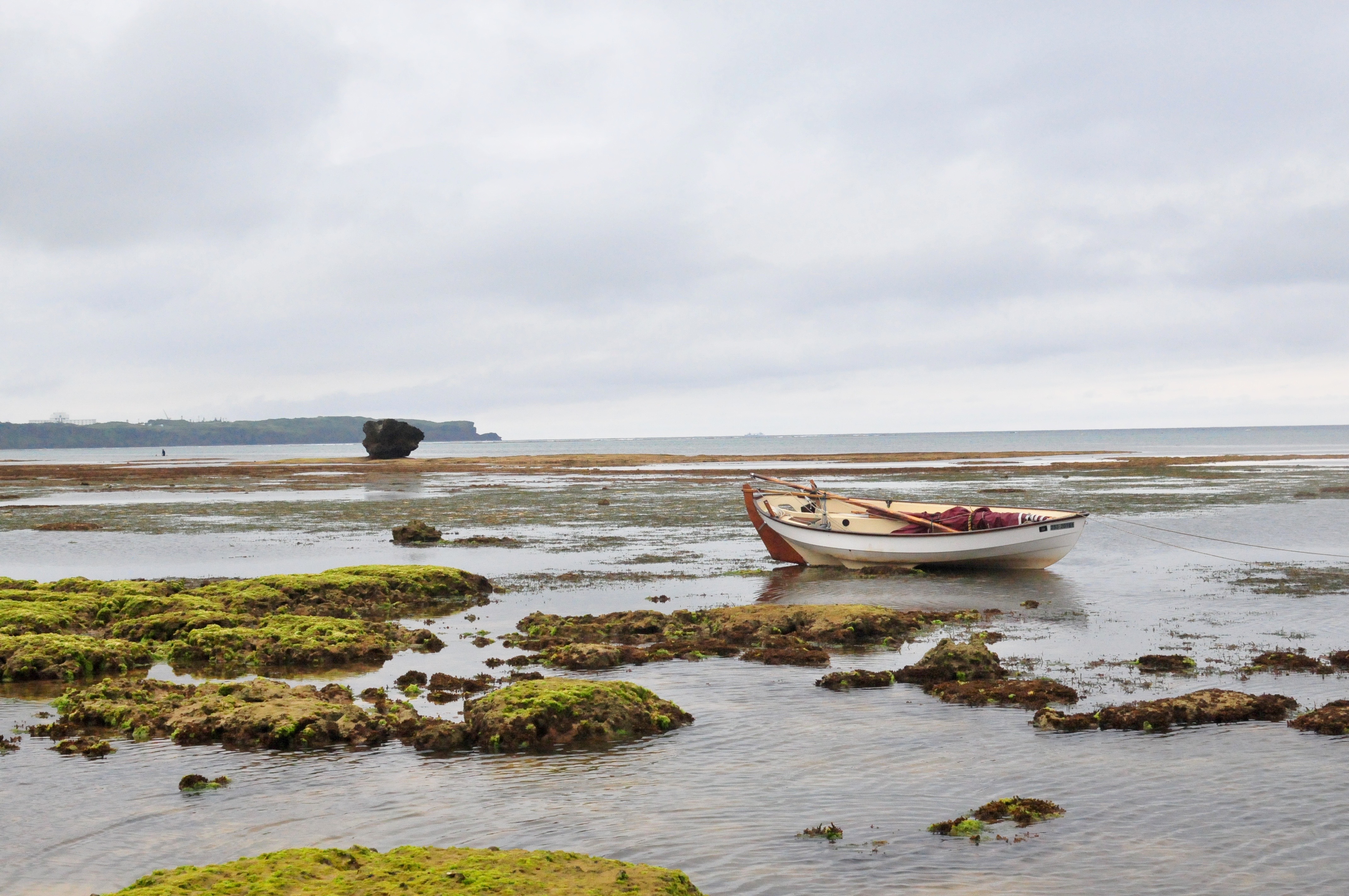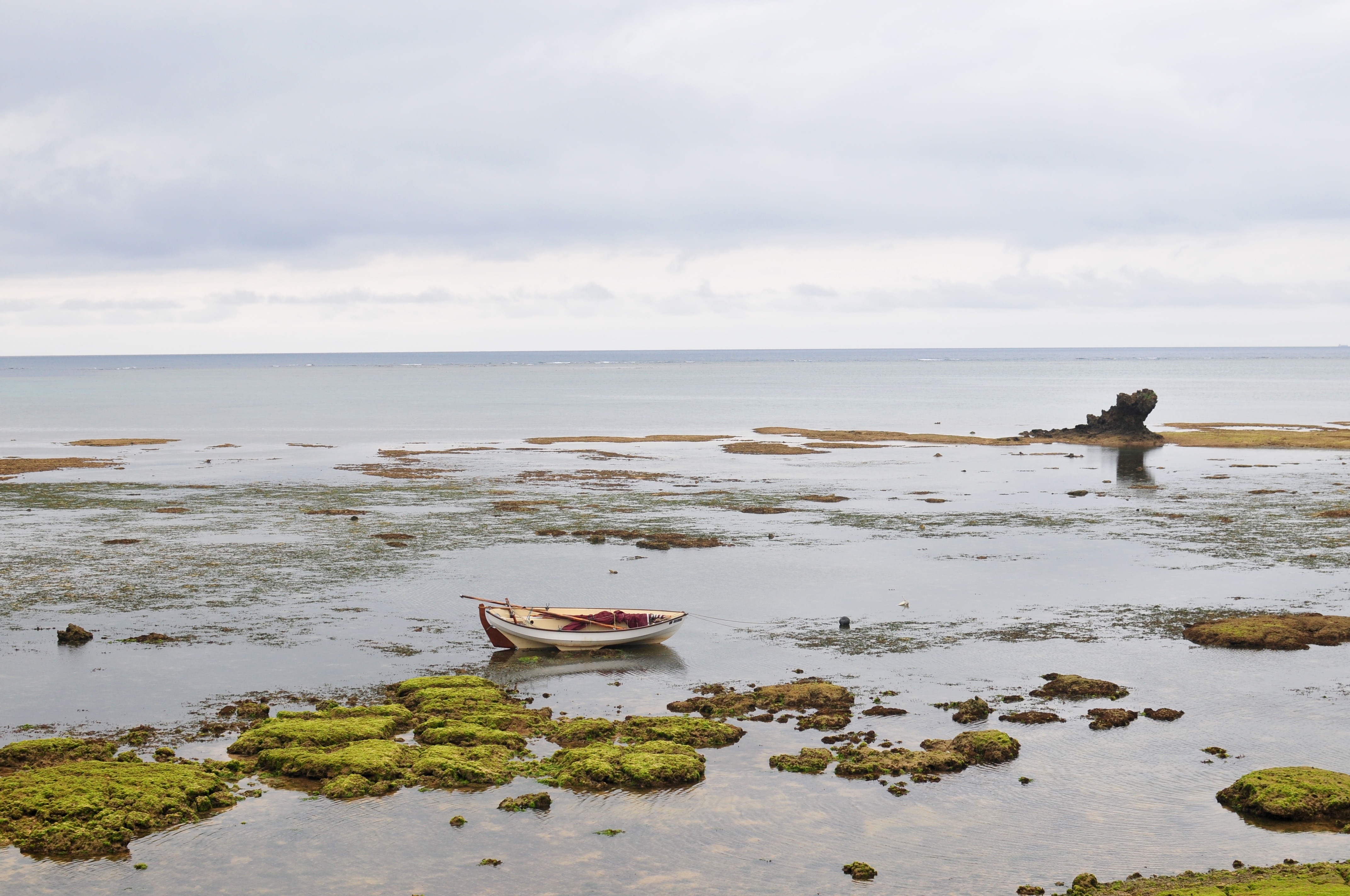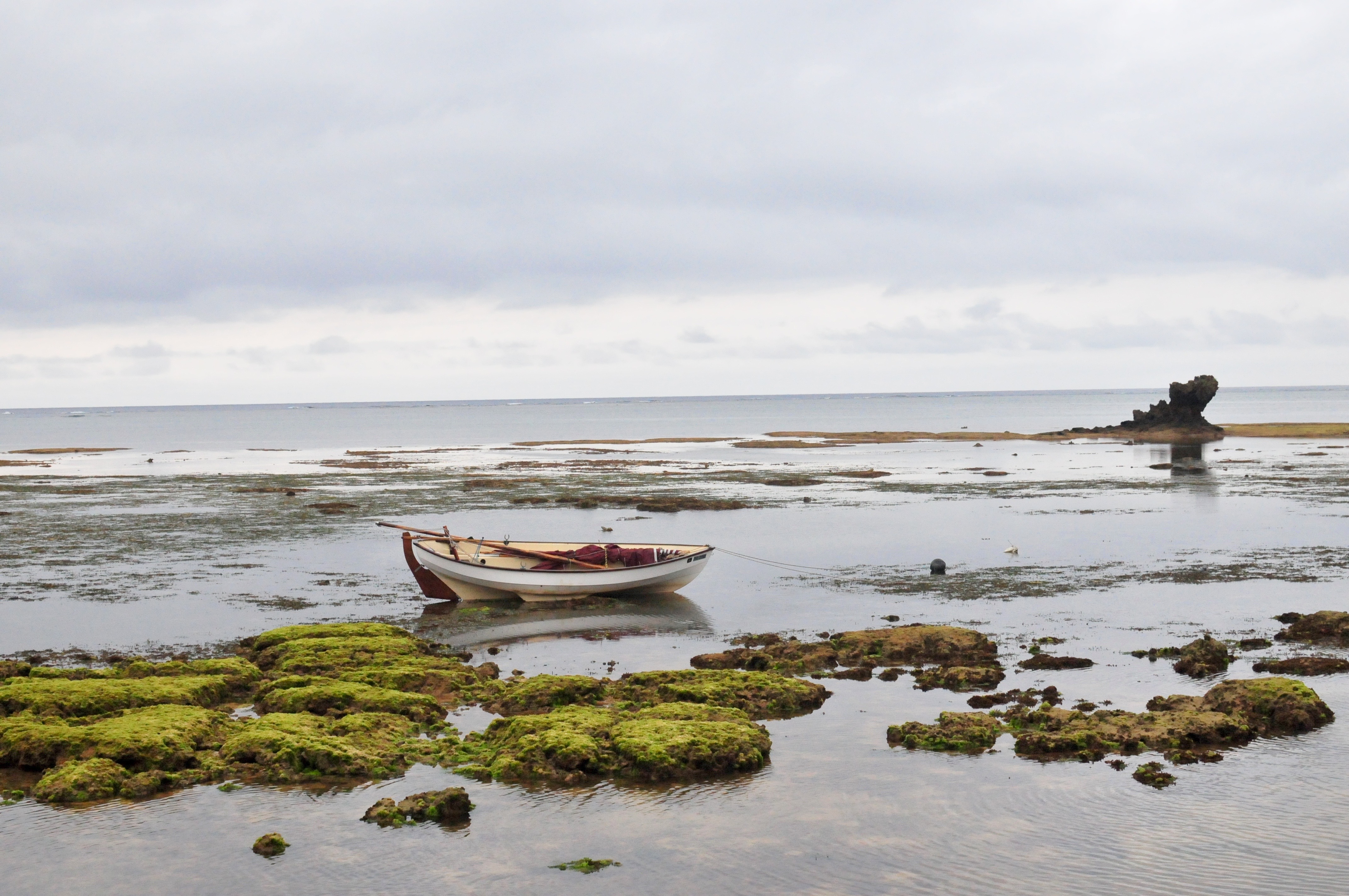 This a delightful place, admittedly prettier with blue skies. I go for a snorkel and then set off home. The wind has got up and is blowing right on the nose. The tide is low and the channel away from Spanish Pete is technical with reef on one side and big rocks on the other. I beat up, tacking every 3 or 4 minutes until eventually reaching a channel through the reef and open water. Now I have to get home. Of course I have brought, no food, nor water, nor sunscreen. The wind is now quite fresh and I charge off towards China, going like hell but not in any direction in which I would like to go. 3 hours and a half later, I am off the house after a hard-bitten sail down the west coast of the island. I loved every minute and thank you Flying Fish and Roseate Terns for keeping me amused. Spring tides making the passage into the lagoon and so the mooring very difficult. There is only one channel of deep water through the reef and the tide is so low that all the reef is fully exposed effectively creating a wall around the lagoon with just one way in, which we will call the Iron Gate.